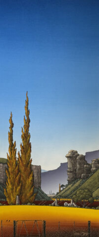 Johan has developed a very distinctive style. Thin application of oil resembles airbrush work which contrasts well with areas of thick impasto. Scratching through the paint creates perspective and texture.